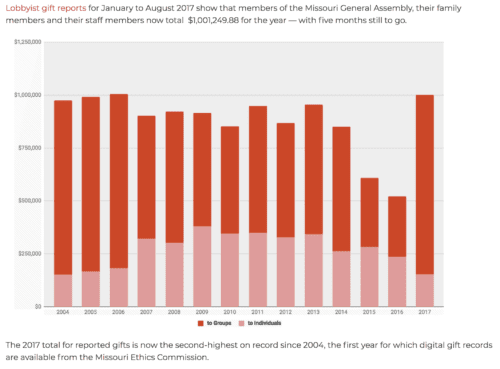 - Clean Missouri coalition crunches the numbers: total value of gifts from lobbyists to legislators from 2004 to March 2018 has reached more than $12.5 million
